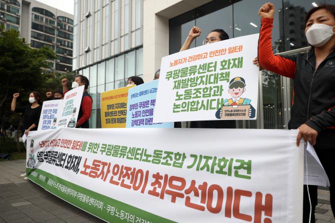 공공운수노조 쿠팡물류센터지회는 오늘(18일) 서울 송파구 쿠팡 본사 앞에서 기자회견을 열고 사측에 경기도 이천 덕평물류센터 화재 사고의 책임 규명과 재발 방지대책 마련을 촉구했습니다.