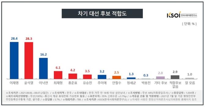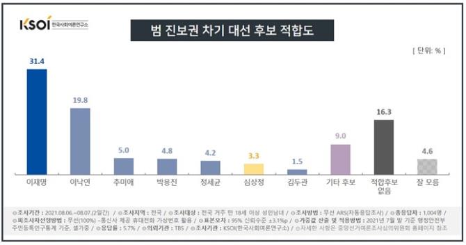 범 진보권 차기 대선 후보 적합도 조사에서는 이재명 전 지사(31.4%), 민주당 이낙연 전 대표(19.8%), 추미애 전 법무부 장관(5.0%), 민주당 박용진 의원(4.8%), 정세균 전 국무총리(4.2%)의 순으로 집계됐습니다.