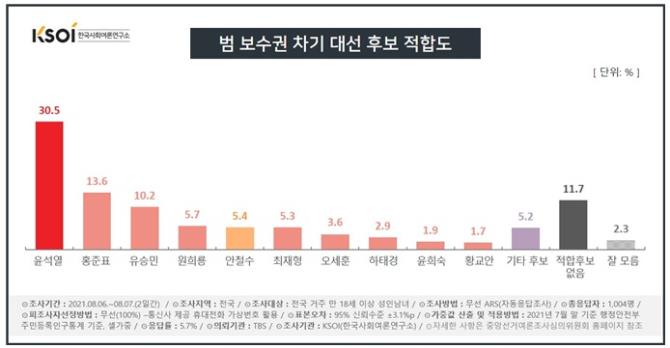 범 보수권 차기 대선 후보 적합도는 윤 전 총장(30.5%), 국민의힘 홍준표 의원(13.6%), 유승민 전 의원(10.2%), 원희룡 전 제주도지사(5.7%), 국민의당 안철수 대표(5.4%), 최재형 전 감사원장(5.3%) 후보 순이었습니다.
