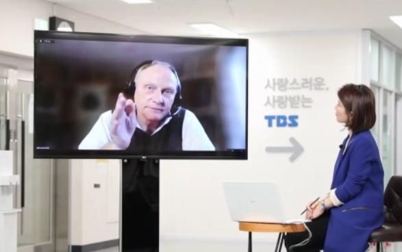 2021 노벨경제학상 수상자 데이비드 카드 교수가 최형주기자와 대담을 하고 있다. <사진=TBS>