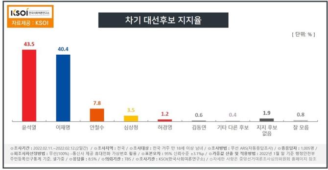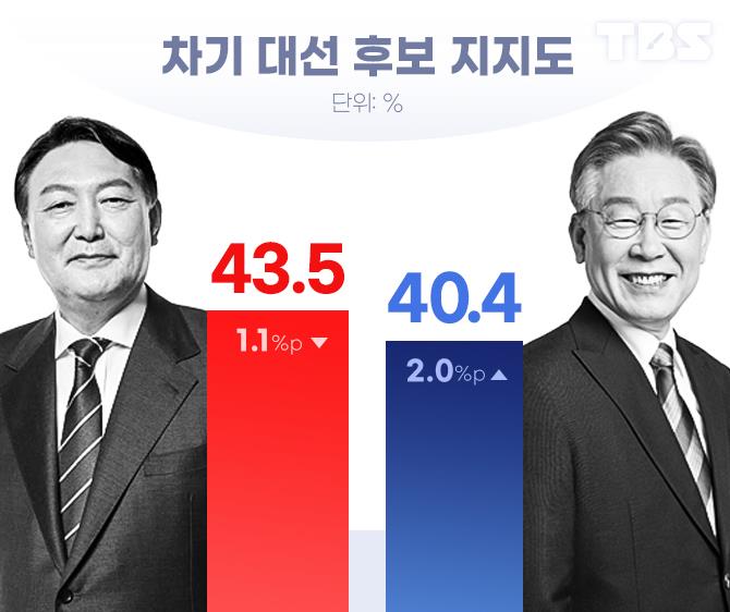 한국사회여론연구소(KSOI)가 TBS 의뢰로 지난 11일부터 이틀간 전국 만 18세 이상 유권자 천5명을 대상으로 차기 대선후보 지지도를 물은 결과 이재명 40.4%, 윤석열 43.5%로 조사됐습니다.