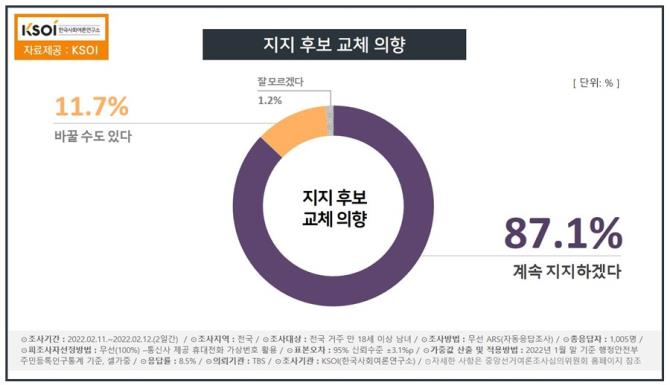 현재 지지하는 후보를 투표일까지 계속 지지할 지 묻는 질문에 응답자 87.1%가 ‘계속 지지하겠다’고 답해 지난주 대비 3.2%포인트 상승했습니다.