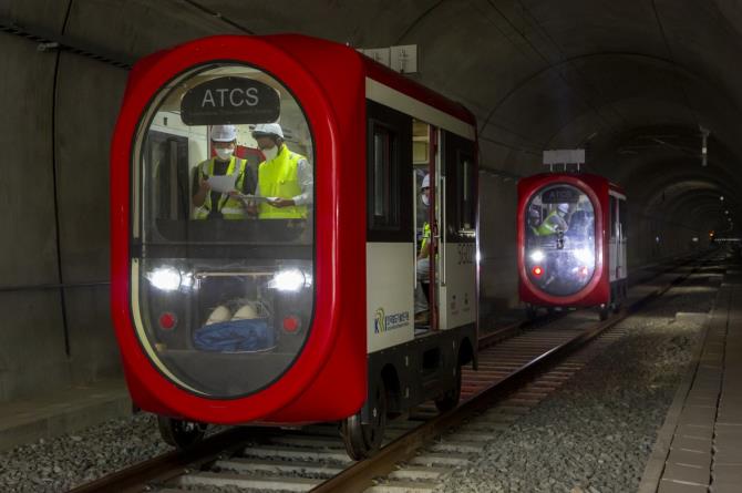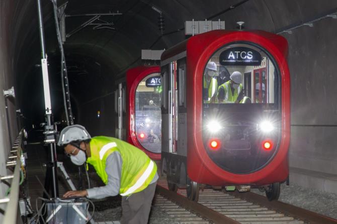 충북 청주 오송 한국철도기술연구원 철도종합시험선로의 터널에서 2대의 축소시험차량으로 T2T 통신 기술을 시험하는 모습 <사진=한국철도기술연구원>