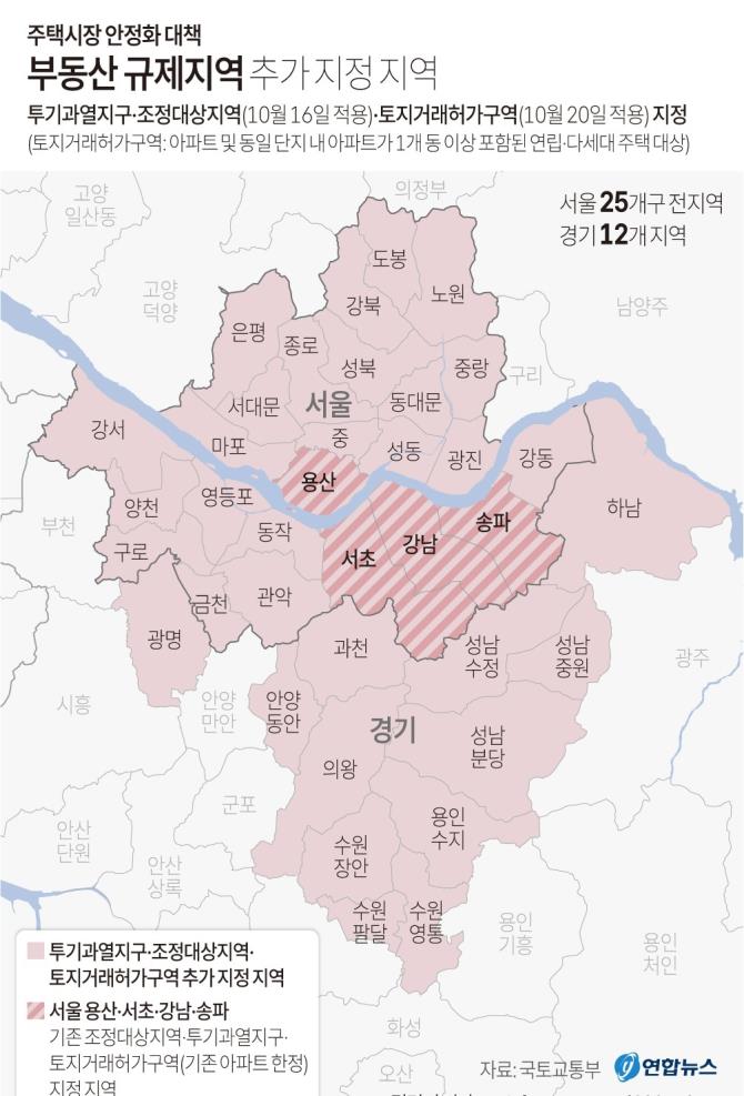 이에 따라 현행 서울 강남 3구(서초·강남·송파구)와 용산구를 포함한 서울 25개 자치구 전체와 경기도 12개 지역(과천시, 광명시, 성남시 분당구·수정구·중원구, 수원시 영통구·장안구·팔달구, 안양시 동안구, 용인시 수지구, 의왕시, 하남시)이 조정대상지역과 투기과열지구로 묶여 규제지역으로 추가됩니다.