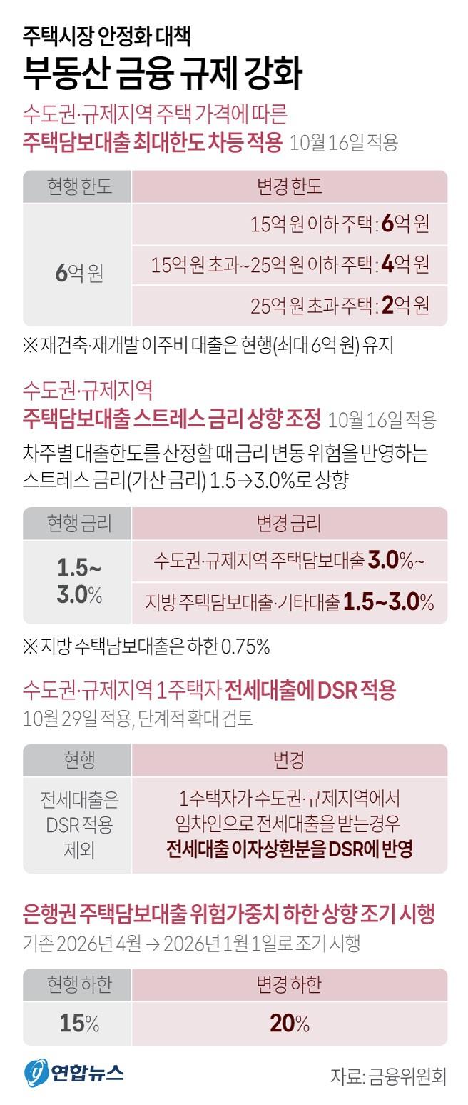 수도권·규제지역에서는 15억 원 초과∼25억 원 이하 주택의 주택담보대출 한도가 현행 6억 원에서 4억 원으로, 25억 원 초과 주택은 2억 원으로 낮아지며, 15억 원 이하 주택은 지금과 같은 6억 원이 한도입니다.