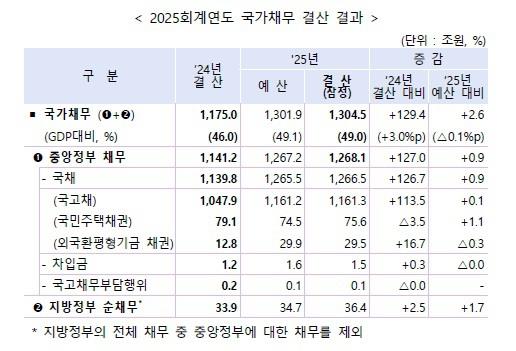 이는 1년전 결산(1,175조 원)보다 129조 4,000억 원 증가했고, 당초 예산상 전망치(1,301조 9,000억 원)보다는 2조 6,000억 늘어난 것입니다.